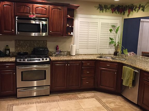 Exquisite Home! This large corner lot home has been beautifully updated with its Travertine Floors and Granite Counters. Enjoy the large open concept floor plan with its 4 Bedroom 2 bath or use the 4th bedroom with French doors as an office. Updated kitchen with custom mahogany cabinets and newer GE stainless steel appliances that are all remaining. Fireplace in great room has a touch of country elegance. Light and airy home with vaulted ceilings, crown moldings, decorative arches, and Plantation Shutters. Tastefully decorated paint colors throughout with chandeliers that are eye catching plus ceiling fans throughout. Newer plumbing and electrical have been completed in different parts of this home. The front of the home has a relaxing courtyard while the backyard has an large swimming pool to enjoy your summer days. Home is larger than county records have stated. It is approximately 2540 sq. ft per seller. Buyer to verify and due their own due diligence.