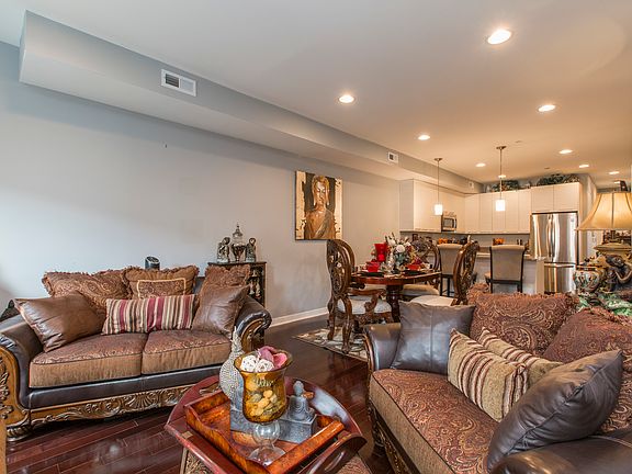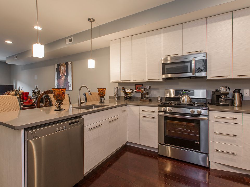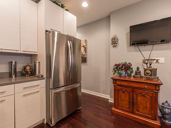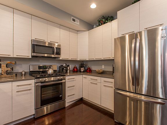 Newer construction, 2nd floor, contemporary 1 bedroom, 1 bath condo with gourmet kitchen,and large private balcony! Open floor plan great for entertaining! This unit features hardwood floors throughout, large living room, and top of the line kitchen that includes Quartz counter tops, high-end cabinetry and stainless steel appliances. Custom tiled bathroom with double sink and full sized washer/dryer combo complete this meticulously maintained condo. Low condo fees and approximately 6.5 years remaining on the tax abatement. Central Air. Pet friendly building.