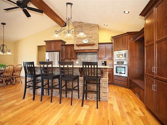 Beautiful split bedroom ranch features all the space you could need in 2,162 +/- sq feet. Step inside to be greeted by open concept living room with vaulted ceilings, built-ins and gas fireplace. Adjacent to the living room find the kitchen featuring SS appliances, custom cabinetry, tile backsplash and large island. Dining area overlooks the 4 season room with access to back patio. Master features tray ceiling, full bath with dual vanity, tile walk in shower and spacious walk in closet. Main floor laundry with washer and dryer. 3 bedrooms and full bath with dual vanity and tub shower complete the main floor. Lower level has 10 foot ceilings, framed, electrical complete and wood burning fireplace installed ready for your finishing needs. Egress window for future bedroom, full bath and family room. 3.5 attached garage with bonus room off the back for storage/dog kennel area. Well maintained and move-in ready!