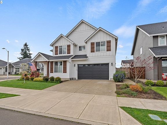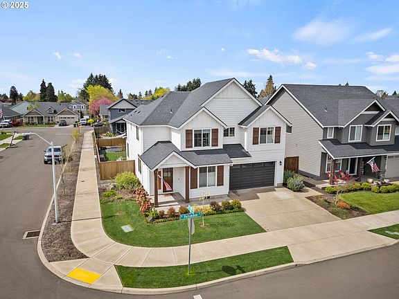 Welcome to this beautifully designed semi-custom farmhouse-style home. Built in 2021 and perfectly situated on a expansive corner lot...one of the largest in the neighborhood. From the moment you arrive, the charming tight knot cedar soffit entry welcomes you inside, where thoughtful upgrades and modern finishes create a warm, inviting atmosphere. Gather in the great room, where custom built-ins provide the perfect backdrop for cozy evenings, while upgraded lighting and black hardware throughout add a touch of sophistication. The open-concept kitchen is a dream for entertaining, featuring a stunning 10-foot extended island, gas range, built-in drawer microwave, farmhouse sink, pot filler, soft-close hardware, and a brand-new upgraded dishwasher (2024). The main-level den has laminate floors and elegant glass French doors, offering a perfect home office or creative space.The private primary suite offers a retreat-like feel with enhanced soundproofing, solid core doors, oversized walk-in closet, vaulted ceilings, and a spa-inspired en-suite featuring a barn door entry, an extended mud-set walk-in shower with dual shower heads—including a luxurious rain shower—and extra bathroom storage. Three additional bedrooms, plus a flex room that could easily become a 5th bedroom, 2nd office, workout space & more!Enjoy the expansive backyard which is designed for everyone's enjoyment. Equipped with front and back sprinklers, 6 raised garden beds for your farm to table needs, and a custom tiled firepit where friends and family can gather. A large covered patio extends your living space outdoors, ideal for summer bbqs or a quiet spot to begin or end your day. This home is generator-ready to provide peace of mind. With NO HOA, you have ample freedom and flexibility. Conveniently located near Maple Park, walking trails, Willamette Valley Country Club, and shopping, this move-in ready home blends modern style, comfort, and everyday convenience. This home won't last long!