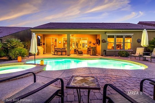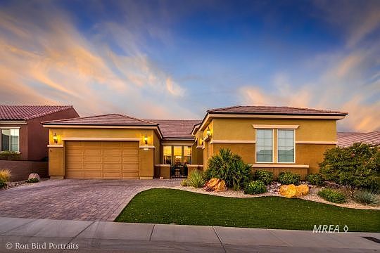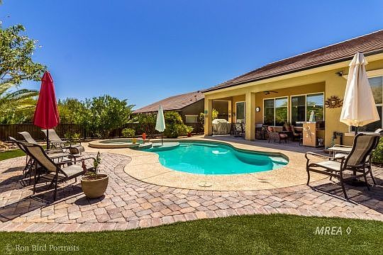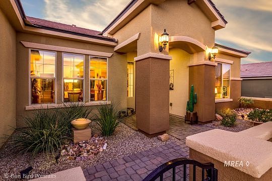 UPGRADED VERBENA, THIRD CAR GARAGE, POOL & SPA!!!! SID IS PAID IN FULL! This well appointed home on an over sized lot has MANY beautiful upgrades throughout. Curb appeal includes brick paved driveway and an Inviting courtyard lead to the front door. The open dining and great room space greets you upon entry. Private large den with double doors and a beautiful stone accent wall is located on the front of the house for your office privacy. The Chef's kitchen upgrades include Cherry Wood cabinets with pull out drawers, granite counter tops, stone back splash above counters and on bar wall, double oven, built-in wine refrigerator and under cabinet lighting.The home boasts new motorized shades and custom blinds throughout the house. Additional upgraded features include two toned paint inside and out, Large 18" tile on diagonal and crown molding. Backyard oasis includes an outdoor snack bar on the patio with built in mini fridge along with wiring for Cable TV. The best outdoor feature is the SOLAR/PROPANE HEATED POOL WITH SPA!!! Privacy screen fence surrounds the backyard area with a peek a boo view of the Virgin Mountains. DO NOT MISS OUT ON THIS GEM IN THE SUN CITY COMMUNITY