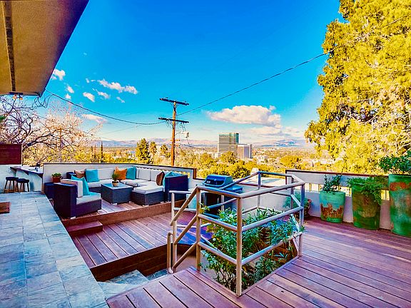 Views, Views, Views. Nestled within the coveted Sherman Oaks Hills, just below iconic Mulholland Drive. This immaculate remodeled retreat defines indoor-outdoor living with spectacular unobstructed 180 degrees views. The well-designed open concept interior presents a neutral color palette blending natural wood flooring, slate tile, stone fireplace, and floor to ceiling walls of glass showcasing dramatic mountain and city light view. There are two comfortable bedrooms, which includes a generous master suite with walk in closet, en-suite spa style master bathroom with Toto bidet, oversized jetted tub, and steam shower. **Designed by one of America's most celebrated chef's the galley kitchen will satisfy your culinary desires, stainless steel appliances, wine cooler, raw Caesar stone counter tops, and large preparation table. Inspiring sunrises and brilliant sunsets frame the stage of the breathtaking outdoor living areas, enormous redwood deck, slate tiled side yard with string lights for intimate al fresco dining under the stars, or evening cocktails at the outdoor bar overlooking the gorgeous view. Picturesque side yard secret garden with redwood deck, blooming roses, and beautiful bougainvillea offers additional views. Additional features include: New central air system. Gated keyless entry, Ring camera system, indoor/outdoor speakers, and double garage. Located in one of LA's most sought-after neighborhoods, just a sunset stroll to Ventura Blvd's restaurant row, Whole foods and convenient westside access.