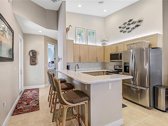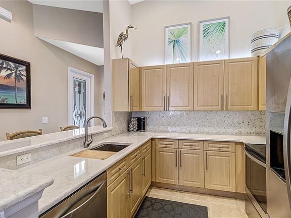 Beautiful home in Seabreeze Shores, in a premier section of the Peppertree Pointe - part of Water's Edge marina. This attached villa has been upgraded extremely nicely! It features 3 bedrooms, 2 full baths, an upgraded kitchen with quartz countertops, new stainless steel appliances, gorgeous back-splash and cabinets, upgraded lighting, an amazing light & bright glass entrance door (hurricane proof), a very comfortable open great room, an oversized 2 car garage, a spacious master bedroom with walk-in closet, a large ensuite including a spa tub with new separate shower and a beautiful screened patio. The home had zero hurricane damage and is very well maintained. A long-planned new roof has just been installed! The garage just got beautifully coated with epoxy even up the wall, it looks amazing and keeps the garage meticulous! The boating community features 3 heated pools, tennis and pickleball courts, a community boat ramp, access to a private marina with adjacent private beach. LOW HOA FEES. NO FLOOD INSURANCE NEEDED, this is not in a flood zone. You are just minutes away from entertainment, restaurants, 20 minutes to the airport, 15 minutes to Fort Myers Beach and Sanibel Beaches.