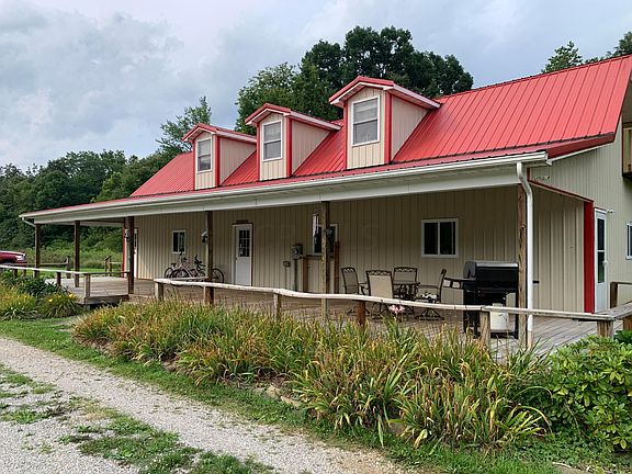Charming country living at the gateway to Amish country.This 2 bed 3 bath home features over 2000 sq ft of living area, 885 ft of road frontage and a 5 acre pasture. Large eat in kitchen, laundry, office or possible third bedroom on main level. Massive 12x60 covered front porch perfect for entertaining family and friends. Second level living room with additional covered deck for peace and tranquility. Radiant floor heat, exterior wood furnace and natural gas to keep you cozy in the winter. Additional 60x40 garage/workshop.Landowner well and mineral rights convey!