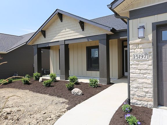 Welcome to 15197 Annabelle Place in the Villas of Lakes of Leo Creek where the combination of design and comfort make this the perfect retreat. This beautiful move-in ready home allows you to enjoy all the of the benefits of building a custom home without the wait. The exterior is inspired bu a craftsman style with a large front fitting porch. Inside, this custom designed and professionally decorated 3 bedroom ranch offer over 2300 square feet of living space. The widened foyer draws your eyes to the great room and large picture windows overlooking the inset covered rear veranda and water view. The kitchen and nook are connected to a sunroom with wall to wall windows. The stunning kitchen was designed with warm tones and custom cabinetry with a wood hood and decorative bronze door pulls. Other features of the kitchen include quartz countertops, tile backsplash and a large double deep island. The owner's retreat offers 2 closets and access to the veranda. The bathroom is complete with a tile shower and a soaking tub. Don't miss out on this one of a kind villa home.