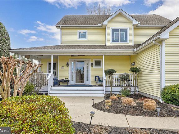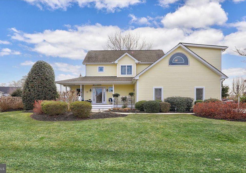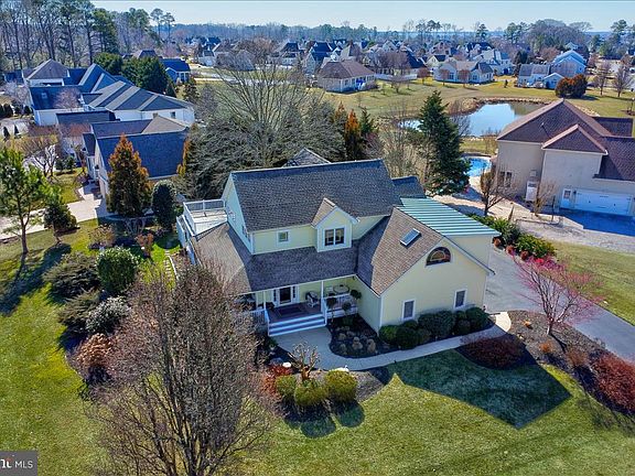 Charming RBYCC contemporary farmhouse perched high on a corner lot with views of the pond. Featured in Delaware Beach Life Magazine, the welcoming wrap around front porch of this home greets you as you enter the gracious foyer with hardwood floors throughout the 1st level. The well appointed kitchen features granite counters, newer stainless steel appliances, a smooth top range with convection oven and a tile backsplash. The dining room flows to the living room with a fireplace and separate access to the sun room. Many lovely details throughout include picture & palladium windows, skylights, built in cabinets with a window seat and a separate office nook tucked away off the kitchen. The 1st floor primary suite has access to a covered porch and has an updated owners bath with a comfort height granite top double vanity and a custom tile shower. The 2nd level is home to 3 bedrooms, 2 full baths and a bonus room. The finished 4th bedroom over the garage can be accessed through the house or through the garage providing the possibility for an in-law suite. The outdoor features are plentiful with a paver patio, hot tub, mature privacy landscaping, 2nd floor sundeck, southern exposure, well & irrigation system and charming arbor that leads to the community green space and pond.