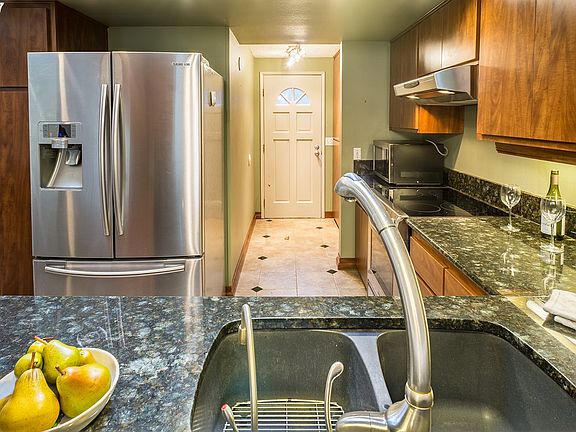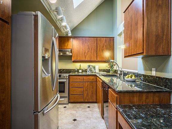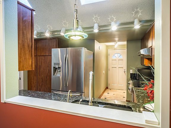 Extremely private townhouse with dramatic living room and gorgeous kitchen remodel. Tandem style with 3 patio/decks, 2 overlooking creek. Hot tub included "as is." Very smart remodel w/ skylights, gas fireplace, built ins, granite, and laundry bedroom level. 3 stat. ductless heat pump& tankless wh for comfort. Under 1 mile to Edgewood Shopping Center, schools, parks. Built around a creek & trails in well run HOA with pool and clubhouse.