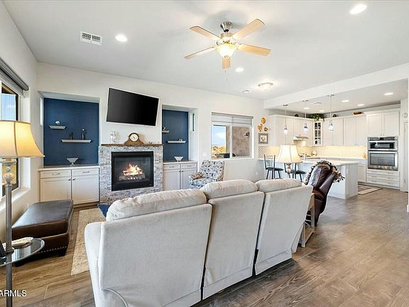 Pure elegance and comfort in this beautiful 3bd, 2 bath home. The open, split floor plan is bathed in natural light displaying g a stunning kitchen with quartz countertops, a chic tile backsplash, upgraded cabinetry, and spacious pantry. The living area features a stone gas fireplace and wood-look tile flooring, the extended dining room offers extra space for entertaining. An oversized three-car garage provides generous storage and workshop area. Seller-owned water softener, on-demand tankless water heater, and prewiring for an electric car charger. The backyard oasis has an extended paver patio, artificial turf, a drip irrigation, and a secure pet-friendly fence. A charming courtyard adds to the home's impressive curb appeal. See Documents for list of additional features and upgrades.
