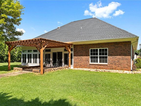 The Crossing patio homes don't come on the market very often! This neighborhood is very convenient to grocery stores, hardware stores, the hospital, restaurants, gyms, and so much more! 152 Camelot Drive is at the end of the street on a cul-de-sac and has a fairly private and level 0.57 acre back yard. Sit next to the shade trees and listen to the relaxing creek down below the property. This brick home has mostly one level living. The only part of the home that has stairs is the finished room over the garage, which has carpet and a window that lets the sun in nicely. The main level has three bedrooms and two full bathrooms. A large sunroom is currently being used in the Spring and Fall, but could be used full time if you wish to heat and cool the area. Sunroom exits into a pergola area. The white kitchen has been re-worked and now has granite counter tops and shiny stainless steel appliances. Pretty hardwood floors cover most of the main level. Eat-in kitchen is now open into the living room space for a pleasant entertaining scenario. The living room has a gas log fireplace. The front two spare bedrooms have good sized closets and share a bathroom across the hallway. The spare bathroom has a large vanity and a walk-in shower. The master bathroom has a large walk-in closet, a garden tub, a separate glass shower, and tile floors. A laundry closet is right outside the master bedroom. Smooth ceilings found throughout the house. True two car garage with two separate doors. The HOA fee includes front yard maintenance only. Water heater was manufactured in 2022. New roof in 2023. HVAC was replaced in 2019. Don't let this special place get away on you!