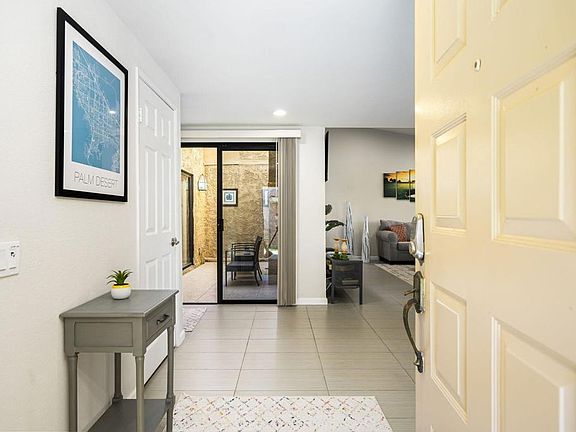 Experience resort-style living in this beautifully updated 3-bedroom, 2-bath condo, ideally located in the heart of Chaparral Country Club.Step inside to a bright and welcoming interior, where soaring pitched ceilings and an open-concept layout create a spacious, sophisticated atmosphere--perfect for both entertaining and everyday living. Just off the entry, a unique central atrium fills the space with natural light, adding a tranquil and stylish focal point.The fully remodeled kitchen boasts modern finishes, sleek stainless steel appliances, and a custom bartop that seamlessly connects to the living area--ideal for casual dining and social gatherings.Step outside to your private covered patio overlooking the scenic 8th hole--a par 3 that plays across water. This north-facing patio offers panoramic golf course views and provides the perfect mix of shade, comfort, and natural beauty from morning through evening.Inside, elegant tile flooring runs throughout the main living areas, while the bedrooms offer soft carpeting for added comfort. Each bedroom features mirrored closet doors and built-in storage, with one guest room offering direct access to the atrium and a private ensuite--ideal for guests or a home office.The primary suite is thoughtfully tucked away at the end of the hallway for maximum privacy and includes a generous walk-in closet and a spa-inspired bathroom. Both bathrooms have been tastefully renovated with contemporary vanities, designer lighting, glass-enclosed showers, and elevated fixtures. The primary bath adds a touch of indulgence with a luxurious jetted soaking tub--your own personal retreat.Tucked away from busy streets yet just a short stroll to the clubhouse and one of the many community pools and spas, this home strikes the perfect balance of peace and convenience. This home also features owned solar, providing energy efficiency and long-term savings--an added bonus to your desert lifestyle.Whether you're seeking a full-time residence, a seasonal escape, or a ready-to-go rental, this move-in-ready gem checks every box. Come experience the very best of desert living in one of Palm Desert's most desirable golf communities.