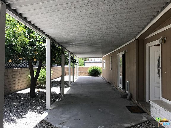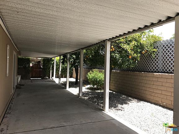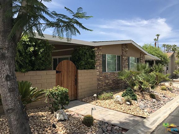 Highly upgraded 2 bedroom, 2 bath stone-faced home with its beautiful desert landscaping and modern garden lighting. Enter into the private spacious patio area through the classy wood gate and masonry privacy wall. Inviting leaded glass front door opens to a separate entry with coat closet, and then leads into the vaulted ceiling, fully dry-walled and bull-nosed, textured great room with dual glazed windows, white wood plantation shutters everywhere you look. Notice the wide base moldings, too. The French doors from the formal dining to the patio have mini-blinds between the two pieces of glass. Beautifully redone kitchen is flooded with light from the large skylight, and recessed lights. Gorgeous wood stained cabinets with self closing draws, and granite counters, stainless appliances, and pantry. The fresh oversized double shower in the hall bath as well as a second shower and garden tub in the master bath with its separate sink/vanity areas provide the quality you are looking for