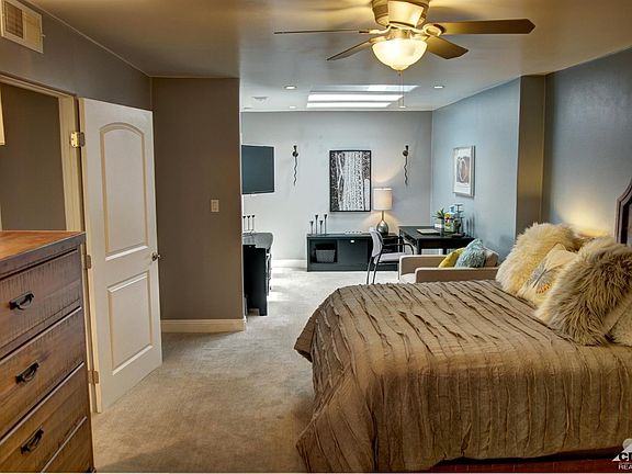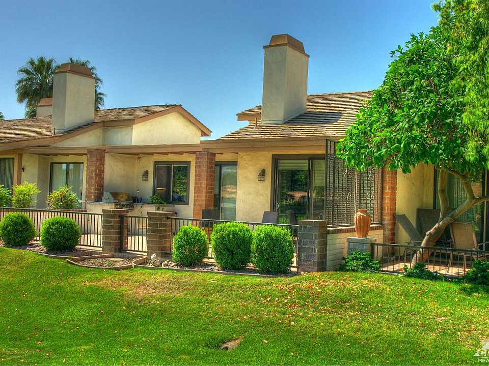 Gorgeous, Updated, Expanded 200 Plan with atrium converted to living space. Almost everything updated within the last few years including HVAC, flooring, window coverings, cabinets, appliances, double pane windows and water heater. Above the fairway location provides additional privacy and expansive view of the golf course. Courtyard and expanded patio paved with interlocking paving stones and patio area also features a Built-In BBQ. Other features of this move-in ready home: Remote controlled blinds, clerestory windows, trash compactor, quartz countertops in kitchen and baths, multiple skylights, ceiling fans, closet organizers, built-in wardrobe/dresser, large custom showers with multiple multi-directional shower heads and a large 2 space garage with cabinetry. Monterey Country Club is one of the most active clubs in the desert with 27 holes of golf, tennis, pickelball, updated fitness center and clubhouse. Multiple membership options exist. HOA dues include social membership.