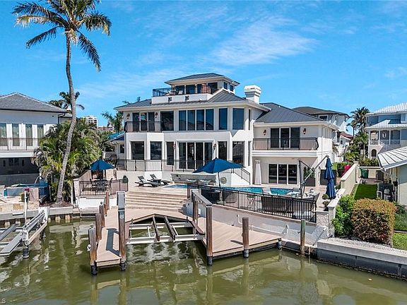 HUGE PRICE IMPROVEMENT. Ultra wide bay views unlike any other home, a sky-high waterfront fortress with 360° views, boat dock, pool, and southern exposure. Prepare to be captivated by this one-of-a-kind vertical masterpiece—a multi-story waterfront fortress in Naples that redefines luxury coastal living. With each level offering a unique experience, this architectural gem is designed for those who crave views, space, and unforgettable moments. From the moment you arrive, the circle driveway welcomes you with ease and elegance. Step inside to discover a custom-designed residence overflowing with natural light, dramatic floor-to-ceiling windows, and exquisite finishes throughout. Nearly every room showcases magnificent bay views, and the much-desired southern rear exposure ensures all-day sun and post-worthy sunsets from your pool deck. The ground level features a versatile family/recreation room with a full bathroom—ideal for guests, a gym, or game nights—that opens directly to the sun-soaked pool deck and private boat dock. Boating enthusiasts will love the direct Gulf access, updated pilings, and electric lift accommodating up to a 10,000 lb boat. The beautifully designed pool, surrounded by stunning travertine pavers, invites relaxation amid tranquil Gulf breezes. The second floor boasts the main living quarters with soaring ceilings, multiple dining areas, a custom wet bar with wine rack, and a show-stopping living room designed for effortless entertaining and everyday elegance. Stone pillars and travertine marble flooring elevate the ambiance, while expansive glass windows frame the surrounding water views. The third floor offers two spacious guest suites, each with private en-suite bathrooms and scenic water views for the ultimate in comfort and privacy. The fourth floor is home to the luxurious owner's retreat with skyline views, a skylight above the bed, a jetted tub, oversized walk-in shower with dual shower heads, and a generous walk-in closet. Also on this level is a private glass-enclosed home office, perfect for remote work or creative inspiration. The fifth floor, or “Crow’s Nest,” is a private 360-degree lookout accessed via a stunning spiral staircase. This entertainer’s dream space includes a large balcony offering panoramic vistas of Naples, the bay, and glimpses of the Gulf, ideal as a sky bar or relaxation lounge. This custom home includes 3 bedrooms and 4.5 bathrooms, a gourmet kitchen with quartz countertops, custom cabinetry, and stainless steel appliances. The backyard is fully fenced for privacy, and the layout offers space and comfort for everyone. This is not just a home—it’s a lifestyle. Schedule your private showing today.