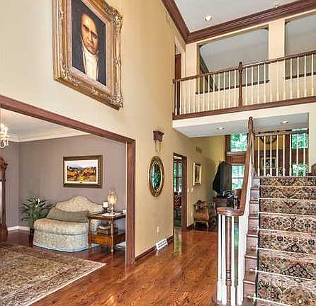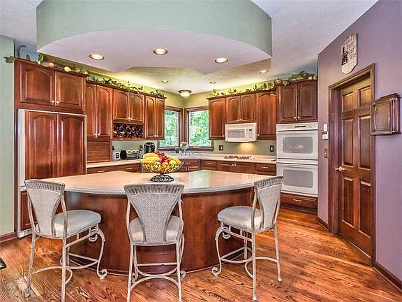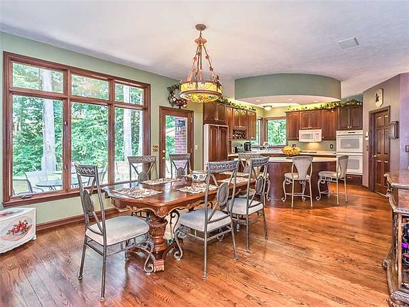 Private Custom home sits on 2.95 acres! A 2 story entry welcomes you to an open floor plan with distinctive features that include gleaming hardwood floors, trey ceilings, crown moldings and 6 panel solid hardwood doors. 1st floor boasts a paneled den with built ins, a kitchen with large corian center island, cherry cabinets, walk in pantry and open to the family rooms. Palladium windows frame the custom paneled fireplace in the family room. A formal living room and dining room completes this level. Master suite includes a sitting area with double sided fireplace to the spacious private bath, huge walk in closet and separate vanities. Finished lower level has several rooms for play or storage. A fenced in ground pool highlights the yard and there is a 3 car attached and 2 car detached garage for all of the family vehicles.