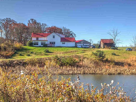 AUTHENTIC HISTORICAL ONE-OF-A-KIND HOUSE. WORMY CHESTNUT LOG INTERIOR WITH EXPOSED BEAMSin dining, living, and den area. New private master bedroom up with separate stairs. SWEET SUNROOM. large laundry-workroom. Big extra room for office, craft, workout, music or whatever your needs with outdoor entrance. 20.54 Ac. green pastures, fish pond, springs, stream. Double detached cinderblock garage. Circular driveway around the big pond.