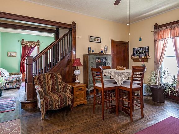 Original hardwood floors and trim throughout the main living area. Home features tall ceilings. Large entry room with the option for Dining or more living! There is a Master Bedroom with a Full bath on the 1st Floor. Upstairs offers 2 Bedrooms with spacious closets and an updated Full bath with a sliding Barn Door. Back door entry features a Mudroom. New Roof in 2016. There is a driveway on the north side of property next to the detached garage. The detached garage is 1 car, the other side of the garage belongs to the neighbor. The detached garage is one building but on the interior the garage spaces are individual spaces.