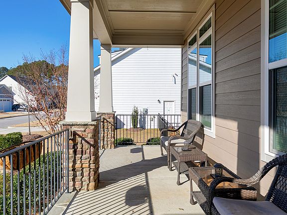 This front porch greets you into this one story beautifully appointed home that has been perfectly maintained. Feels like a new home. Gorgeous tile work in kitchen & bathrooms along with granite in kitchen & owner's suite. Large garden tub & sitting ledge in shower. Large sunroom & wood flooring throughout main living area of home. Home features include easily accessible single story living experience with the Peace of mind having a Whole House Generator (hooked to gas). Relax on the screened in porch while the HOA maintains your landscaping. Enjoy sipping your favorite beverage on the large patio. Tankless gas water heater. Shop for groceries at 4 stores within minutes of your new home & cook delicious recipes in your gourmet kitchen with gas stove & stainless hood. Or make reservations at your favorite restaurants in West Cary,Durham, Raleigh & Chapel Hill all 10-25 minutes from your front door. Wonderful neighborhood with gazebo & fireplace to relax with the neighbors & in the middle of American Tobacco Trail area & five minutes from the Diavolo Disc course if feeling on the active side.