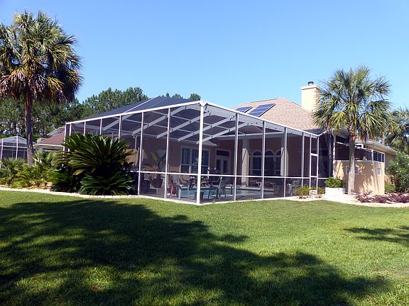 If space is what you crave....you will find it in all aspects of this large home -- and all on one level. This comfortable home with its room for all floor plan showcases openness as soon as you enter the foyer. High ceilings with crown molding and lots of light through custom plantation shutters everywhere enhance the open concept. The Living room has a fireplace with built-in shelves on both sides share a large and open space with a formal dining area that offers seating for many. The well-equipped kitchen has beautiful cabinetry and an island that includes a large sink and storage cabinets. With its overall light color palette in the cabinetry and solid surface countertop, your kitchen will certainly be a bright entertainment hub of your home. Just off the kitchen is a space for breakfast table and generous family room with great vaulted ceilings. The split bedroom plan offers privacy for family and guest alike; master suite with two walk-in closets and large bathroom with spa tub on one side of the home and another three bedrooms and two bathrooms on the opposite side. A huge laundry area is full of cabinets, countertops, and a full size second refrigerator, and washer, dryer and utility sink. A large two car garage and with a golf cart/ workshop section which also has a utility sink. The circular driveway makes easy access to the garage and extra parking. There are three convenient accesses to the fantastic large screen area that has space for seating and grilling and a large in-ground pool with a three feet high waterfall at one end. A separate spa is located in a secluded niche near the master bedroom door. Also there is a hot/cold shower near the back bathroom door. The floor is done in real travertine stone throughout with contrasting color travertine stone coping around the pool. The views from this poolside setting are of peaceful vista and ponds that renowned Hombre Golf Club shares with The Glades Community. With solar panels on the roof and LED lights throughout the inside and outside of the house, 40 dimmer switches, insulated windows and doors, and ceiling fans in almost every room the cost of running the house is low. With all the openings in the home with hurricane approved rating the insurance is lower. Located within minutes of dining, entertainment, shopping, and a variety of Panama City Beach events. The Glades at Hombre Golf Club is a place you will be proud to call HOME. Less