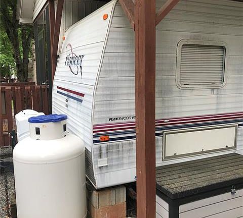 This unit is so cute, clean and fresh. The screen porch has the Easy Breezy Windows that convert back to a screen porch by simply dropping the windows. New paint and flooring throughout. 2 bedrooms at opposite ends of the camper and a real house bathroom with big walk-in shower. Brand new Propane on Demand water heater and new refrigerator to remain. The current owners have completed the wall between the camper and the porch. Nicely done underpinning, outbuilding that is 8x10 with power. Nice outdoor area in the backyard. Plenty of parking in front. Some furnishings remain. Must be with Realtor to gain access to the park.