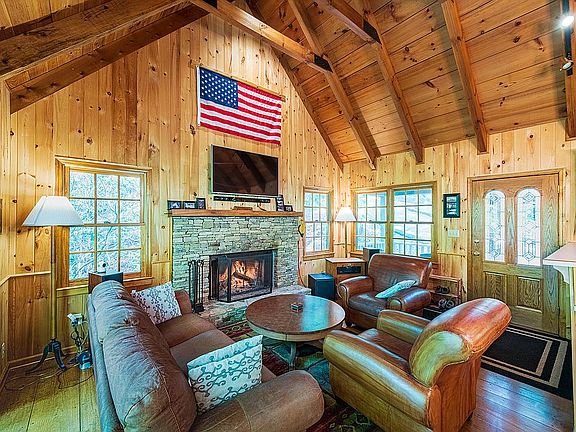 This home is under contract and pending sale. This lovely plumbers style cabin has been finished throughout in pine. It is located steps from the upper falls and even sports its own stream and waterfall in the back yard. The stone fireplace is oversized to light up the entire floor. There is a sleeping loft for an additional couple making 4 rooms total. Sold furnished. Excellent condition. Updates include newer roof, New HVAC, Glass sliders and Septic redo in 2019. Needs nothing. This home was loved by meticulous owner.