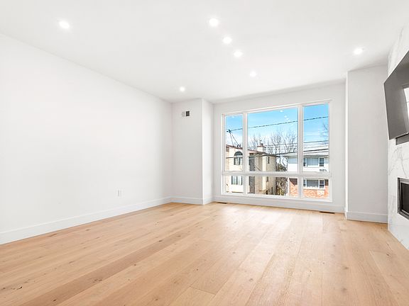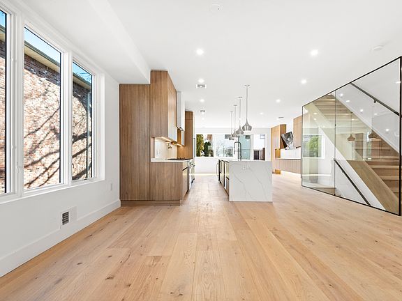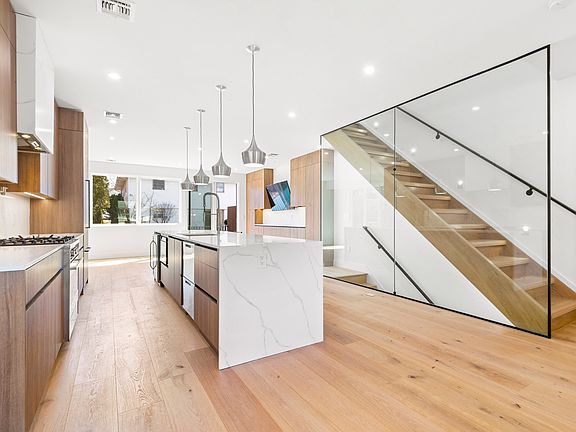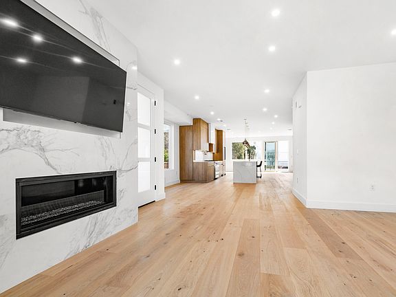 A modern home with hardwood flooring throughout and high ceilings. The living room features a sleek linear fireplace, creating a stylish and cozy ambiance. The large chef's kitchen is designed with floating countertops, a large kitchen sink, and a paneled refrigerator/freezer, with a wine cooler and a large kitchen island, providing plenty of space for cooking and entertaining. The top floor of the house includes three large bedrooms and two full baths, with the master bedroom featuring a spa-like master bath with heated floors, a large freestanding tub, glass rainfall shower, and dual vanities. The house is equipped with high-efficiency AC and hydronic heating systems, as well as central vacuuming. It is also smart home-enabled with an ultra-quiet WIFI garage door opener and built-in security cameras, providing convenience and security for the homeowners.