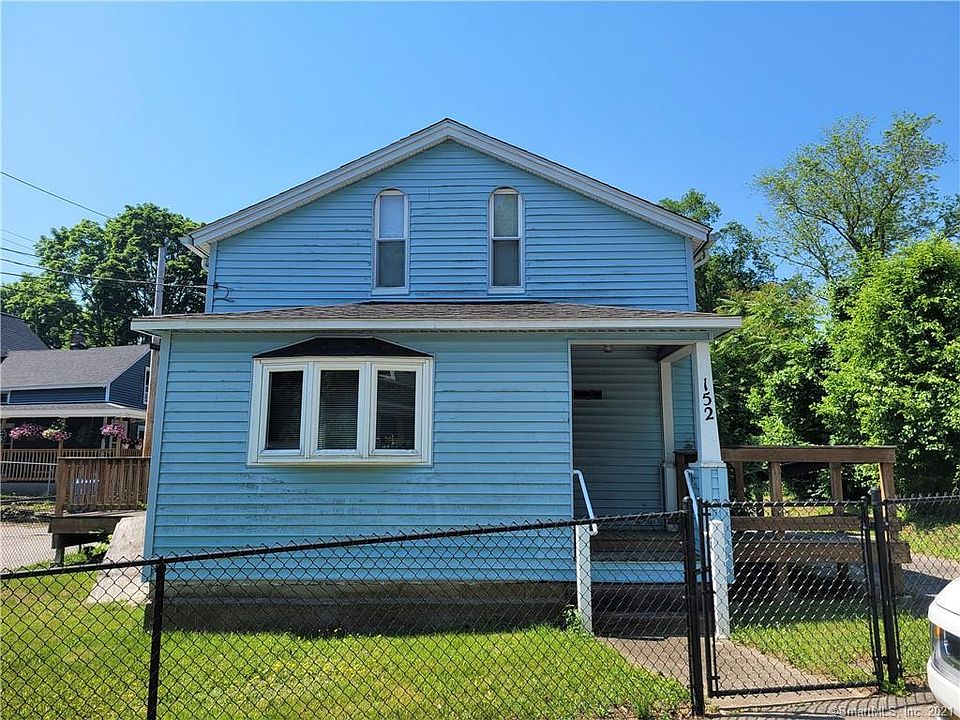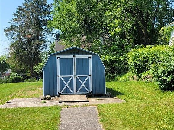 Adorable home on a corner lot with chain link fence, paved parking area and nice storage shed. The main level laundry room leads to the eat in kitchen with sliders going to the deck. Living room with hardwood floors and bathroom also on this main level and bedrooms are both on second level. Home is livable but the handyman can build equity with some TLC and updates.. Central A/C is installed but not sure if the condenser is working.