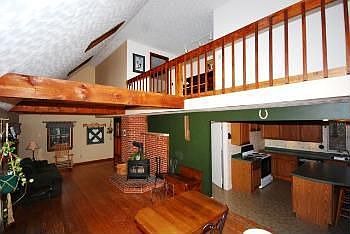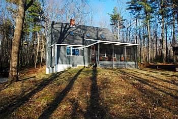 This character-filled open-concept cape is situated far back from the road and features cathedral ceilings, skylights, wood floors, natural wood beams, woodstove, lg screened-in porch, 2-car garage underneath, large shed, walking trails close by.