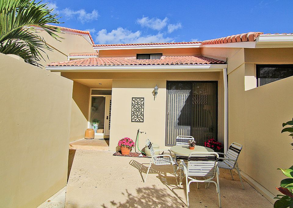 Fully renovated townhome located in the highly sought after Patio Homes of PGA National. Super short walking distance to the PGA National Spa and Resort!! Enjoy beautiful golf views from this bright & spacious 2BR/2BA open plan townhome with garage. Large living area with wall to wall sliding glass doors open to cozy screened porch overlooking the 9th fairway of the Fazio Course. Spacious master suite with full bath, 2 closets and washer dryer. Downstairs bedroom with full bath and sliding glass door access to large private front courtyard. Top of the line finishes with crown molding.