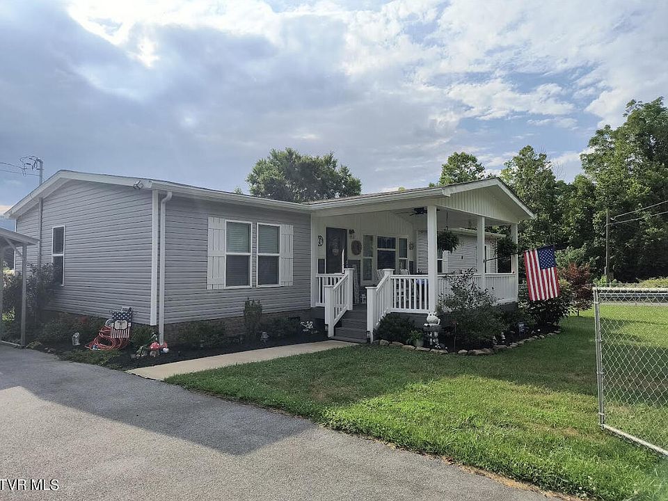 This home has cuteness painted all over it! Mint condition! One of the nicest double wide's I have ever sold. Has a formal living room and and den off of the dining area. The den has a gas fireplace and lots of built ins. Gorgeous kitchen with granite counters. Lots of storage and counter space in the kitchen. Beautiful cabinetry. The laundry room is off the kitchen and you enter through a screen door!. (love it) The washer and dryer stays. There is storage in the laundry room. The formal living room is nice and roomy for overflow from the den. The bedrooms are split. The primary is adjacent to the living room and huge for a King. Nice big primary bath with a beautiful soaking tub fit for a queen. Walk in shower. A his and hers closet. From the concrete driveway enter in the front door from a oversized covered front porch. Lots of space for a rocking chair afternoon, viewing the mountains and listening to the creek that you own a slice of. Yes, you own water front on Stoney Creek and I've been told there is great fishing on any day you have time to fish. The lush level yard is completely fenced. This home sits on a permanent foundation with a brick skirt. There is a new 2 car carport that will stay. You will not find a home any more beautiful in this price range. Come see for your self. Nothing to do, but bring your personal property and move in. Information deemed reliable but not guaranteed. Buyers & buyers agents must confirm.