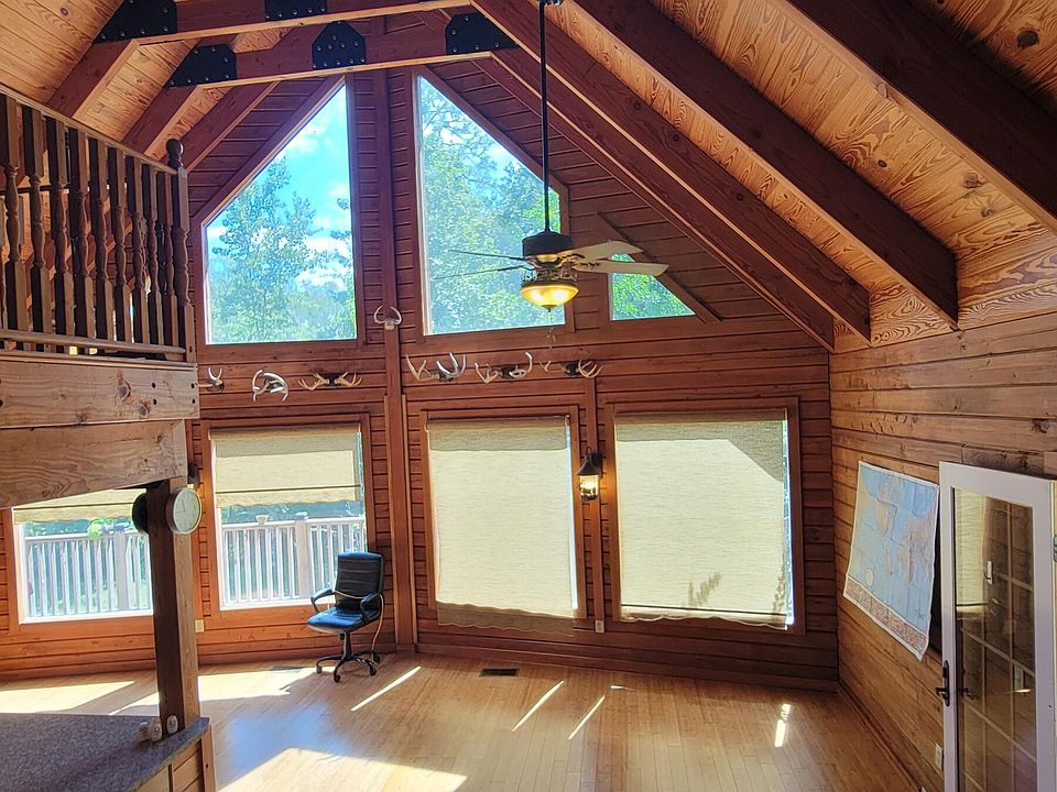 LOG CABIN - Amazing St. Johns Riverfront custom-built, 2-story A-Frame, 1469 sq. ft. log home w/22' ceiling, tongue n groove wall boards, hand crafted doors, pine & bamboo flooring plus lots of unique accents to make this a truly one-of-a-kind home. This great room concept home features floor-to ceiling windows w/privacy/sun-protection film overlooking the 700'+/- meandering boardwalk w/bench to the riverfront, an island kitchen w/lots of shelving, Whirlpool appliances to include a flat surface stove, 2 bedrooms & a bath on the 1st floor & 2nd floor master bedroom & sitting area w/wet bar overlooking the great room. The wraparound porch offers two covered seating areas. Covered boathouse w/swing & seating area, greenhouse, shed, many fruit trees & more. Bring your Boat!