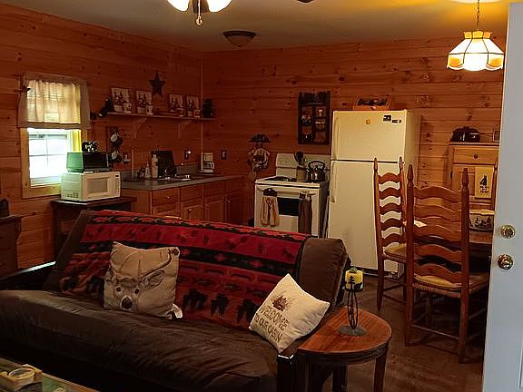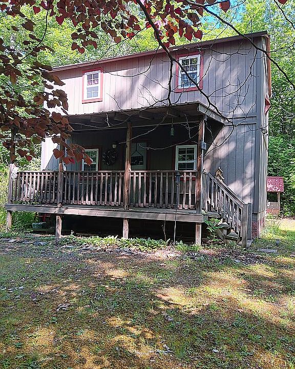 Two story cabin, full bath and bedroom upstairs , open floor plan downstairs with living room, dining room and kitchen with 1/2 bath. Cabin backs up to government forestry land.