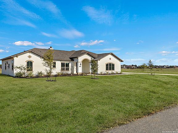 BUILDER FLEX-CASH INCENTIVE AVAILABLE! *** Welcome to this stunning single-story Texas Home in Floresville, featuring 4 bedrooms, 2.5 bathrooms, and 2,308 sqft of living space. The charming stucco exterior with a side-entry garage adds curb appeal, while inside, you'll find luxurious LVP flooring, soaring high ceilings, and a cozy wood-burning fireplace. The kitchen is a chef's dream, with custom white cabinets and an oversized island, perfect for entertaining. The primary bath offers a spa-like retreat with a stand-up shower and double vanities. This home also includes a dedicated office which may also serve as a 4th bedroom and a covered patio for outdoor enjoyment. Situated on a spacious one-acre lot, the property is filled with natural light and adorned with designer finishes. Enjoy gorgeous sunsets in this peaceful community. Just minutes to shopping and a short commute to San Antonio. *Note: Grass in the photos has been digitally enhanced for visual appeal.*