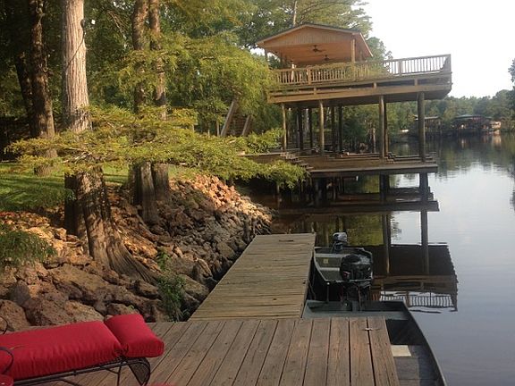A MUST HAVE!! Rustic cedar home located on Caddo Lake/Big Cypress Bayou in a restricted, gated community with private neighborhood boat ramp. The home has multiple deck and outdoor sitting areas and cook area. Open beneath, 4 cars can comfortably park without taking up sitting space. The home sits on metal I-beams on a concrete foundation and has all metal framing including interior studs and trusses. All inside and outside walls are insulated. Inside, the home features wood floors and walls, solid wood interior doors along with electric appliances, washer and dryer included. The living, dining and kitchen area are open with aspen walls and rustic tin ceilings with wood burning stove set on a rock base with a peeled pine mantle. Both bedrooms are spacious. The master bedroom has two walk-in closets, large bathroom with shower and separate jacuzzi tub, and built-in Browning gun safe. The guest bedroom has its own large closet with cedar walls with aspen ceilings. Resent improvements to the home include interior trim stained, exterior stain and with new batt boards and all deck and porches stained. The home sits on a beautiful, shaded, landscaped yard with 6 large cypress trees along the water's edge with an amazing view of Big Cypress Bayou. A rock retaining wall flows from the grass to the water. The yard also has a rock fire pit on the water side and sprinkler system that utilizes the river water. The back of the property houses a 24x30 insulated metal shop with cement floors, window unit ac, water plumbing and storage in the rafters. This home location also features many hunting and fishing opportunities as well as other water recreation activities. 08/02/16