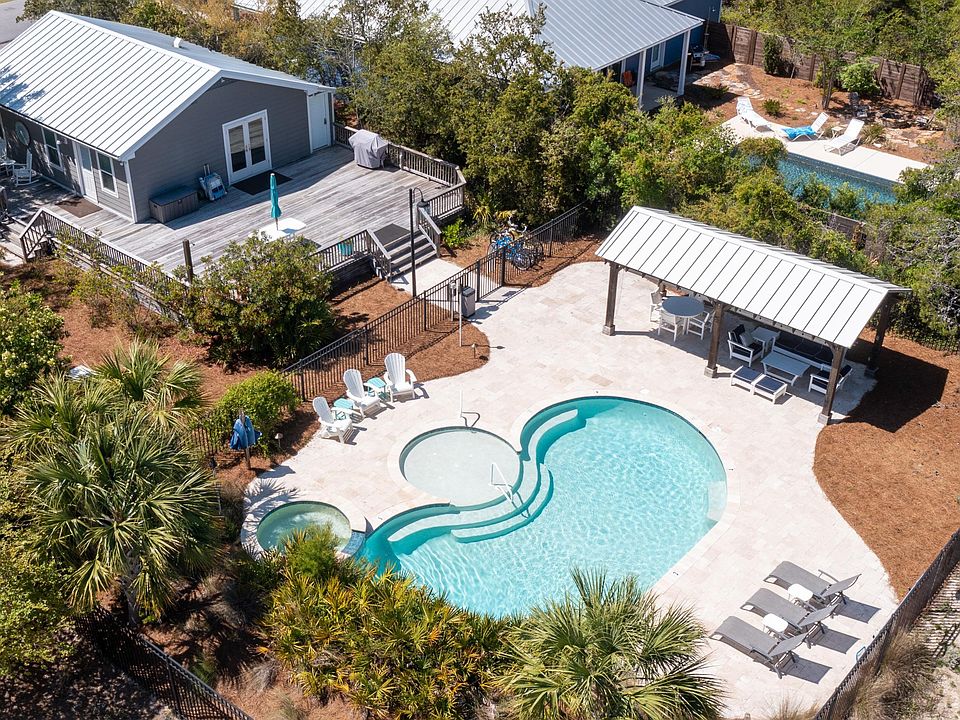 Private Resort quality pool and adorable beach cottage, known as 'The Little Gray Cottage' is situated on 1/4acre lot in true 'Old Seacrest'. Only 800 feet, less than a 5 minute walk, from the beach access and when the gulf is churning you can hear the waves from the deck. Actual Rental Bookings 2021 is $86,023 with much of the Fall still open to book. WOW a rental securing some of the highest yearly rental income per square foot in the 30A area. Many vacationers are repeat customers that vacation year after year, read the 5 star reviews from VRBO#3925452LGC OUTDOOR FEATURES:Private RESORT quality heated pool and spa with covered Pavilion and travertine pool deck. The pool includes a large play, lounge shallow area sun deck to let the water keep you cool(10' diameter & 6' depth)