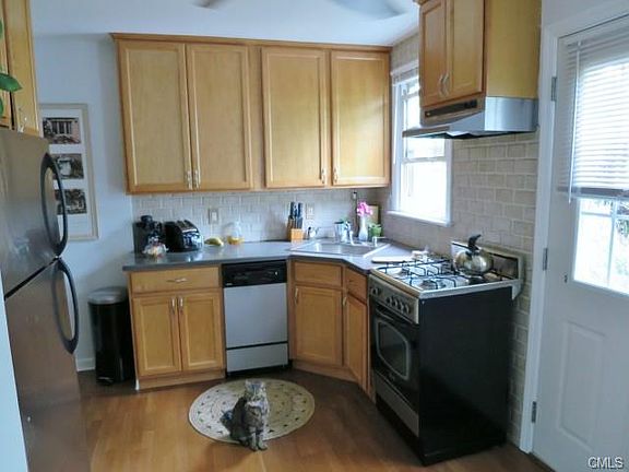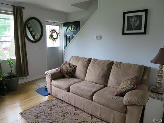This thoughtfully updated townhouse has a light and airy feel with east and west exposure. It boasts a lovely eat-in kitchen with stainless appliances and hardwood floor. Both baths are updated. It is located in a convenient location near the entrance of the complex but set back from the street facing a large courtyard. There is garden space behind the unit which could be converted to a patio if desired. There is also attic potential by installing a pull down staircase. Convenient front and back parking. Sylvan Knoll is an attractive complex located in a park-like 13 acre setting just a mile from Cove Island Beach. Convenient to town, train, shopping, and exit 9 on I-95. Real estate taxes are included in the common charges.