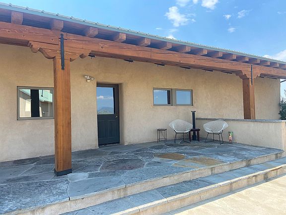 Just minutes from the vibrant City of Santa Fe begins the legendary Turquoise Trail. The iconic and historic byway is the location of this artistically inspired compound. Just minutes from all the conveniences of the City Different but a world away. Sited on a private and fully fenced 5.5 acre parcel the property enjoys expansive vistas, mountain views and dark night skies. The main house features strawbale construction with high cathedral wood deck and exposed steel truss ceilings. The interior walls are hard-trowelled plaster, the floors exposed concrete, and the countertops cast-in-place. The open-floor plan and numerous windows and patio doors invite the natural light while offering a great space for entertaining or just chilling. The chef’s kitchen features a 6-burner Viking gas cooktop, Viking dual-burner convection oven, Viking compactor, Sub-Zero refrigerator/freezer, and Bosch dishwasher. Counterspace is beyond generous on the large island, extended counters and peninsula with casual dining bar. The primary bedroom opens to the courtyard and includes a spacious walk-through closet. The primary bath features a resort-sized walk-in shower. A jetted tub in the second bath awaits the end of the day. The stand-alone casita is close enough for convenience but separate enough for privacy. Ideal for visitors or rental income, it’s cozy, modern and light-filled. The property also includes a finished garage & studio space, plus carport. The infrastructure includes roof-mounted Solar PV panels and a 3 ac/ft private well. There's plenty of room on the property to add your barn or other improvements. Santa Fe shopping, dining, and medical facilities are just minutes away, as is the Santa Fe airport and I-25 access.