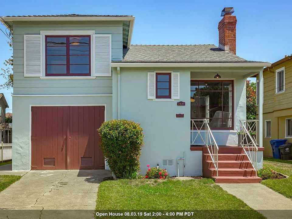 This spacious and attractive split-level home has lots of vintage charm including coved ceilings, HW floors, 2 fireplaces, original hardware and casement and sash windows. Freshly painted with new light fixtures. Separate living and dining rooms with ornamental staircase leading up to 2 sunny bedrooms next to full bath with vintage tiles. Bright white kitchen with contemporary black hardware. Downstairs is a bonus room you can use for a study or crafts. Across the hall is an immense, sunny and spectacular master bedroom with a wood-beamed ceiling, rock fireplace, and second full bath with vintage tiles. Large-scale sliding glass door looks out to big grassy yard with fruit trees and three large raised planting beds. One car attached garage lined with storage shelves and washer/dryer. Fabulous Central Alameda location near bus lines, parks, farmers market and good schools. Great restaurants, shops and bars near by.