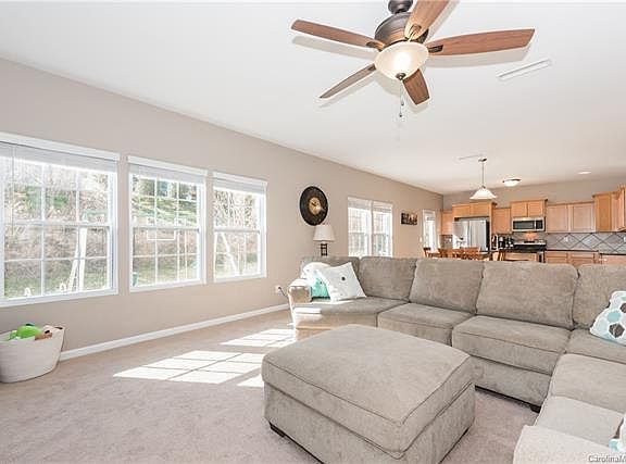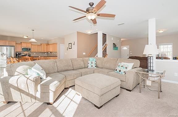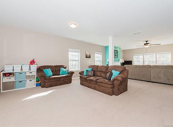 Cul-de-sac 4 Bedroom 2.5 Bath Clover Schools. Open floorpan and Move-In Ready home in Oaks at Clover. Large kitchen with granite, stainless appliances, island and huge walk in pantry. Gas fireplace, 2 large living areas. Master bath has dual sink vanity, garden tub, separate water closet & walk in shower. Bedroom 4 has closet & custom white barn doors, can also be used as a bonus room. Large laundry room upstairs convenient to bedrooms. Front porch, 2 car garage and backyard patio. Walking trail and play set across the street in the Cul-de-sac. Front porch and includes Ring doorbell. Clover School District.