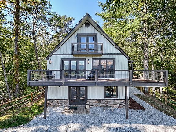 "SunChaser" Lodge is a Stunning Mountain Chalet Retreat on 5+ Acres. Imagine waking each morning to breathtaking long-range mountain views across the Nantahala Mountains. This three-level chalet offers a rare blend of privacy, elegance, & comfort, fully furnished with all-new, designer-selected pieces chosen to highlight the home's modern colors & contemporary style. Every room feels intentional, from the warm gathering spaces to restful bedrooms, all designed to flow seamlessly with the beauty outside. The main level welcomes you with an open-concept kitchen & living area featuring granite countertops, stainless appliances, & rich wood accents anchored by a striking stone fireplace. Large windows frame the views while filling the space with natural light. A spacious bedroom & bath complete this level. Upstairs, a private suite with sitting area & porch creates the perfect escape. The lower level is made for fun with a retro-inspired bar, game area, den, additional bedrooms & bath, providing plenty of space for guests or family. Outdoor living shines with wraparound porches & a lower patio offering panoramic views, while a custom water feature nestled among mountain laurels creates a serene sanctuary for meditation or quiet reflection. Evenings by the fire pit, mornings with coffee on the porch, & weekends filled with laughter in the lower-level bar all feel effortless in this retreat. The five-acre property is beautifully groomed with gently sloping, usable land, ideal for gardens, recreation, or simply enjoying the mountain air. With easy paved access, high-speed internet, & close proximity to Andrews, Murphy, & the Western Carolina Airport, the home balances seclusion with convenience. Whether you dream of a full-time residence, a vacation getaway, or a high-value rental investment, this property delivers. The views are amazing & unforgettable, the furnishings are flawless, & the lifestyle is waiting for you. The view doesn't just impress—it transforms!
