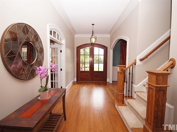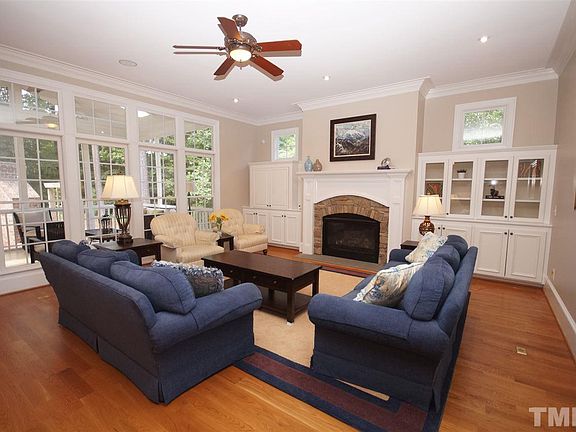 Absolutely Stunning! 5 Bedrms w. Guest Suite down. Attention to every detail. Extensive trimwork, elegant lighting/fixtures. Fresh Paint/New Carpet! Gorgeous Kitchen w. custom cabinetry, granite counters, SS appliances. Family Rm offers breathtaking views of wooded lot, over an acre. Lovely Owners Retreat w. luxurious private Bath...o'sized shower, sep vanities & closets, jetted tub. All BRs have ensuite Baths. Custom Patio w. built-in Gas Grill & Fireplace! Desirable N Raleigh locale, no city taxes.