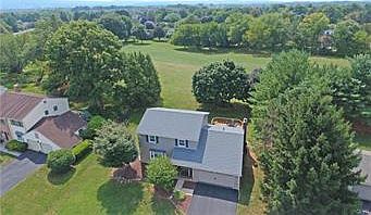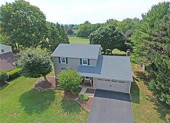 This attractive East Penn home offers four BRs, two full & one half baths, spacious main floor, finished basement, & deck w golf course views. Eat-in kitchen has durable laminate flooring, peninsula for ample counter space, stainless appliances, & large pantry. DR w large window overlooking backyard, & chair rail - open to kitchen & LR for easy entertaining! FR w neutral carpet, wainscoting, wood-burning FP, & sliding door to deck & backyard. Formal living room w large windows & crown molding offers additional space for relaxing or entertaining. Master suite w neutral carpet, large closet, & full bathroom w tile floor, glass door shower, & heat lamp. Three addtl BRs, all w neutral carpet & large closets w shelving, full bathroom w tile floor, bathtub/shower, single vanity, & heat lamp, & linen closet complete the second floor. Fin bsm't provides third floor of finished living space, laundry w utility sink (appliances remain), & extra storage. Backyard w spacious wood deck & shed.