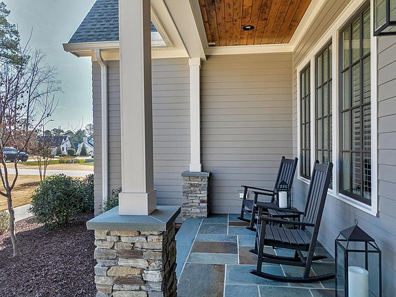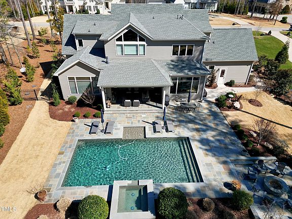 Where luxury meets tranquility, this sprawling estate offers a haven of privacy, an exceptional residence for refined living in Avaliare. The beautiful bluestone front porch with tongue in groove ceiling welcomes you. The soaring two story entry foyer is light filled. Gorgeous engineered hardwood flooring on the main level. You will love working from home in the formal study with cathedral ceiling and glass barn door. Create memorable dinners in the formal dining room with trey ceiling. Entertain in style in the open family room which features a wet bar, a fireplace, built in cabinets & bookshelves, coffered ceiling and easy access through the sliding doors to the rear porch. The well appointed kitchen is a chef's dream with massive center island, tile backsplash, pot filler over the gas range, scullery and walk in pantry. The desirable first floor primary suite offers views of the back yard and pool, incredible walk in closet and luxury bath. Upstairs are three additional bedrooms. The recreation room with wet bar has areas for games, playing pool and watching movies. The convenient walk in attic make your storage needs simple. You will love spending time in the private outdoor oasis. Enjoy the rear porch with fireplace and phantom screens. The salt water pool has a fountain and relaxing spa. Spend the evening around the firepit on the patio. The rear yard backs to a private wooded area. The location is close to shopping and dining, has easy access to 540 and is a short commute to North Hills and downtown Raleigh. You will love this home with attention to detail and fine craftsmanship.