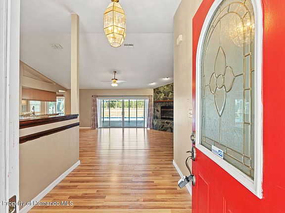 Step inside to a spacious split floorplan featuring a welcoming foyer, cathedral ceiling, and rich wood laminate flooring throughout the main living areas. The great room boasts a stunning stone wood-burning fireplace and sliders that open to the oversized screened lanai and pool area—perfect for entertaining or relaxing in privacy. The formal dining room is filled with natural light from a bay window and features an elegant chandelier.