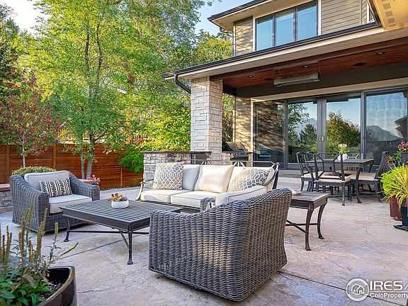 This impressive contemporary home is drenched in natural sunlight & framed by breathtaking mountain views, offering a perfect blend of casual comfort & refined luxury. A grand two-story foyer w/ custom tile wall welcomes you to an open-concept living & dining area, enhanced by 10' ceilings & a wall of south-facing windows & hardwood flooring. The chef's kitchen boasts an oversized granite island, high-end Thermador appliances: double ovens, two dishwashers, & a 55-bottle wine fridge, a butler's pantry with pull-out shelving. The dining area seamlessly extends to a luxurious outdoor entertaining space, featuring both covered & open areas. Enjoy a built-in Vermont Casting gas grill, beverage fridge, cozy gas fireplace, & overhead heaters for added comfort on cool evenings. A secluded hot tub, nestled behind lush landscaping that bursts into bloom from spring to fall, completes this tranquil retreat. Ascend the wide staircase adorned with custom metal railings to discover the owner's suite-a serene & private retreat w/ spectacular Flatiron views, a gas fireplace, a spa-inspired bath w/ steam shower & soaking tub, & a spacious walk-in closet. Two additional bedrooms w/ ensuite baths & walk-in closets, & upper-level laundry, complete the floor. The lower level is an entertainer's dream, offering a recreation room w/ oversized windows, a projector system, pool table, and wet bar with leathered granite counters & reclaimed barn wood. A guest bedroom, bath, & ample storage round out the space. Additional features enhance convenience & comfort: versatile main-level office w/ custom desk & cabinetry, a spacious 3-car garage w/ a dog wash, abundant storage, & a spacious mudroom w/ cubbies & storage. Enjoy the ease of motorized shades & the efficiency of dual HVAC system. Ideally located near downtown Boulder, 3 neighborhood parks, & numerous scenic trails, this luxurious yet low-maintenance home offers the perfect setting to experience Boulder in style.