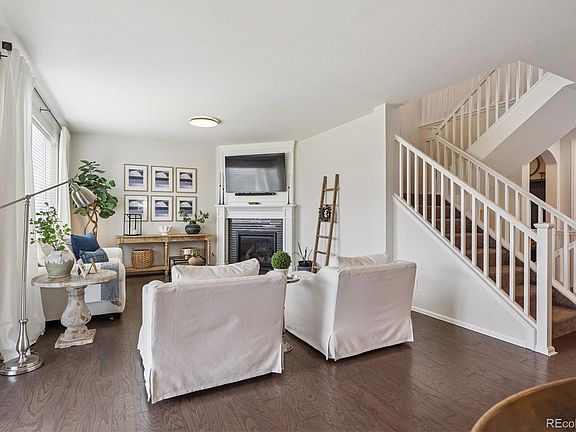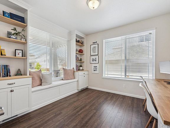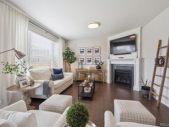 Beautiful DR Horton Home on a Corner Lot Backing to Open Space! Enjoy stunning Colorado sunsets from the spacious front patio of this meticulously maintained home, perfectly situated on a desirable corner lot w/ open space behind. The main level features a bright and open layout with thoughtful upgrades throughout. A dedicated home office with custom built-ins offers a quiet workspace, while a main-level bedroom and adjacent 3/4 bathroom provide flexibility for guests or multigenerational living. The formal dining room, enhanced with elegant wainscoting, is ideal for hosting gatherings. At the heart of the home, the expansive great room with a cozy gas fireplace flows seamlessly into the casual dining area and chef’s kitchen—perfect for everyday living and entertaining. The kitchen impresses with crisp white cabinetry, gleaming quartz countertops, a large island, double ovens, gas cooktop...WOW! Upstairs, a spacious loft provides a versatile second living area or playroom. The generous primary suite includes a peaceful sitting area with fireplace and a luxurious 5-piece en-suite bath. Two additional bedrooms are connected by a convenient Jack-and-Jill bathroom. The full, unfinished basement offers endless potential for future expansion or storage. A tandem three-car garage with epoxy flooring provides ample space for vehicles, tools, and recreational gear. Step outside to a beautifully landscaped, fully fenced backyard featuring a covered deck and a patio with a pergola—ideal for morning coffee, evening relaxation, or summer entertaining. Additional features include an attic fan & dual A/C units for optimal comfort throughout the seasons. Located directly across from the sought-after Terrain Swim Club and Dog Bone Park, this peaceful community offers access to scenic trails, neighborhood parks, and top-rated amenities. Shopping, dining, and the local elementary school are just minutes away. Lovingly maintained, this move-in-ready home is ready for its next chapter!