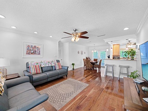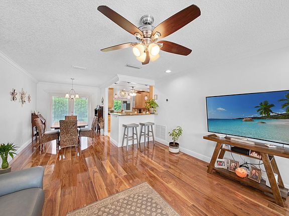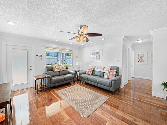 Step into this beautifully updated 2-bedroom, 2-bath home, where style and comfort meet. Featuring wood flooring throughout and high-hat lighting, this home exudes warmth and sophistication. Impact windows provide peace of mind and energy efficiency. The dream kitchen is a chef's paradise, showcasing granite countertops, a stylish tiled backsplash, stainless steel appliances, and a convenient snack bar--perfect for casual dining or entertaining. The primary suite is a true retreat, complete with French doors leading to the patio. Both bathrooms have been tastefully updated with modern finishes for a luxurious feel. Enjoy Florida living at its best with a large, screen-enclosed patio overlooking the spacious backyard, offering plenty of room to relax and unwindall with the added privacy of no rear neighbors.