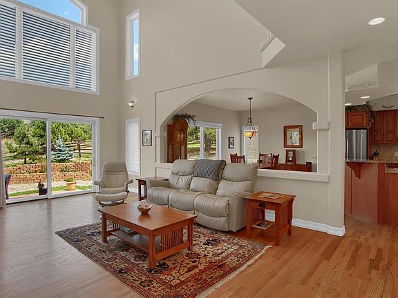 Beautiful custom home in Woodmoor near I-25 for an easy commute to Colorado Springs or Denver. Great ?? acre lot w/ Colorado Blue Spruce trees for privacy, a huge flagstone patio for entertaining w/ a gas stub for grilling, rear split rail fence for kiddos & dogs plus beautiful flower gardens. This home features a leaded front door that leads into the entryway w/an open staircase & hardwood floors w/ a cherry border that flows throughout the main level. French doors lead into the office w/a two-sided fireplace that backs to the great room featuring an open two-story ceiling, built-in cherry entertainment center w/ cabinets & bookcase plus a walk-out to the flagstone patio. Looking through the huge arched wall from the great room is the spacious dining room & gourmet kitchen w/ slab granite countertops, center island w/ a bar & a gas range top w/ down draft, stone backsplash, double wall oven w/ one being a microwave/convection oven, ss appliances & a pantry. New carpet just installed!