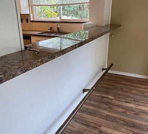 Three bedroom/three bath mid-century modern in Bel Air Knolls. Spacious kitchen with gas range, refrigerator, dishwasher and lots of counterspace. Formal dining with fireplace for living room and dining room. Extra room for family, library or office. Master bedroom with mountain view and large closets. Mirrored bathroom with walk-in shower. Two additional bedrooms with bathroom. Laminate flooring throughout. Mature oak trees with mountain views and tiled patio. Two plus garage including separate laundry room featuring folding counter and washer/dryer. Near Mesa shopping,, Elings Park and Arroyo Burro beach.