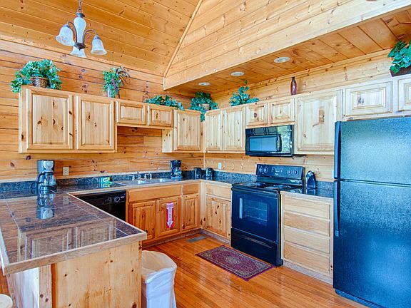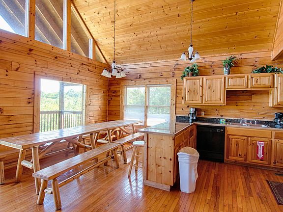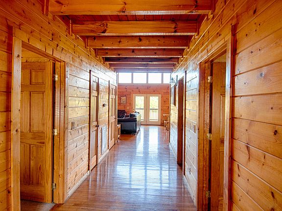 Huge log cabin in established subdivision. Three levels of living area and so much to offer. This would be a great property for cabin retreats, church groups, you name it! Two master suites on the upper level. Nice decks to relax. hardwood floors throughout. Tile in bathrooms. Large kitchen with breakfast bar. Cathedral ceilings. Lower level has three master suites and bunk bed rooms. Buyer to verify all information. Deemed correct but not guaranteed. Large stone fireplace. Just so much to mention on this great property and at this price it will go quickly. Furniture is not part of the sale.