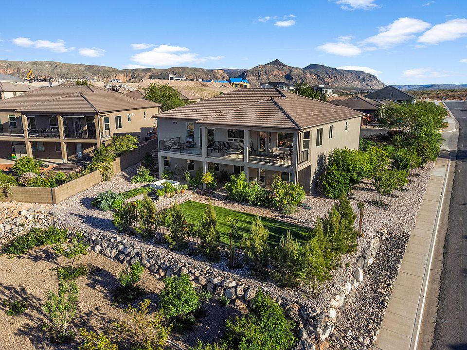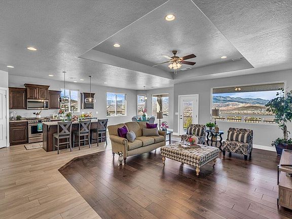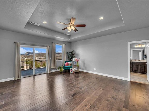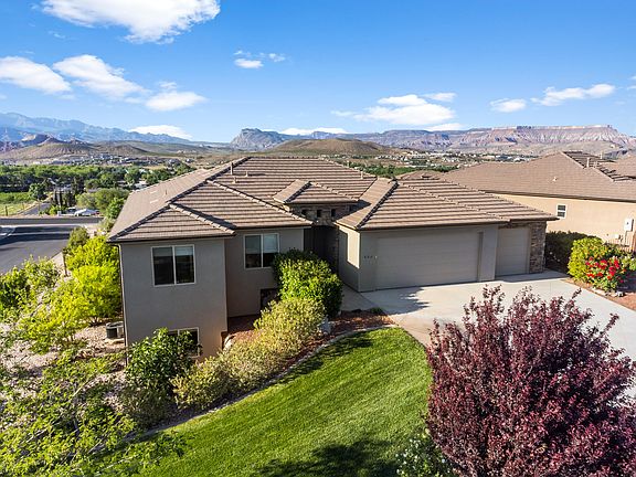 A home that commands a striking presence in this gem community. Fulfilling all of your wants and needs, satisfaction is always guaranteed. Broad open floor plan with picturesque windows which accentuate the spectacular unobstructed views of Pine Valley Mtn & the Hurricane Valley. Appreciate the split master suite, 2 family rooms, perfectly placed upgrades, a 12' x 45' main level covered deck and a .30 acre corner lot highlighted with lush grass, fruit and shade trees and grow boxes for the green thumb owner. Come in, sit down and enjoy the experience of owning this beautiful home.